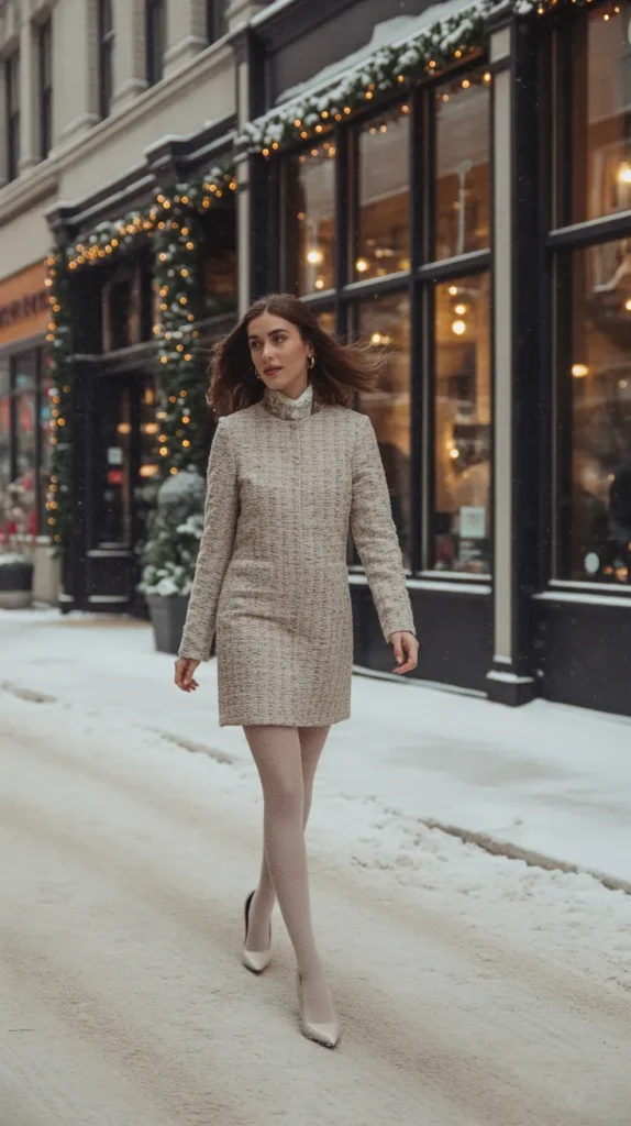 This playful winter outfit blends tactile fabric with a flattering silhouette. The bouclé adds dimension while white tights keep the look youthful yet refined. Great for lunch outings or casual nights out where you still want to look classy.
