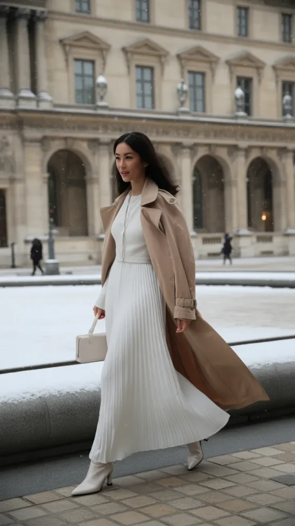 Flowing pleats meet crisp tailoring in this sophisticated combination. The cold weather outfit feels dreamy yet structured ideal for city strolls or formal gatherings. Add gold jewelry and heeled boots to take this look to another level.