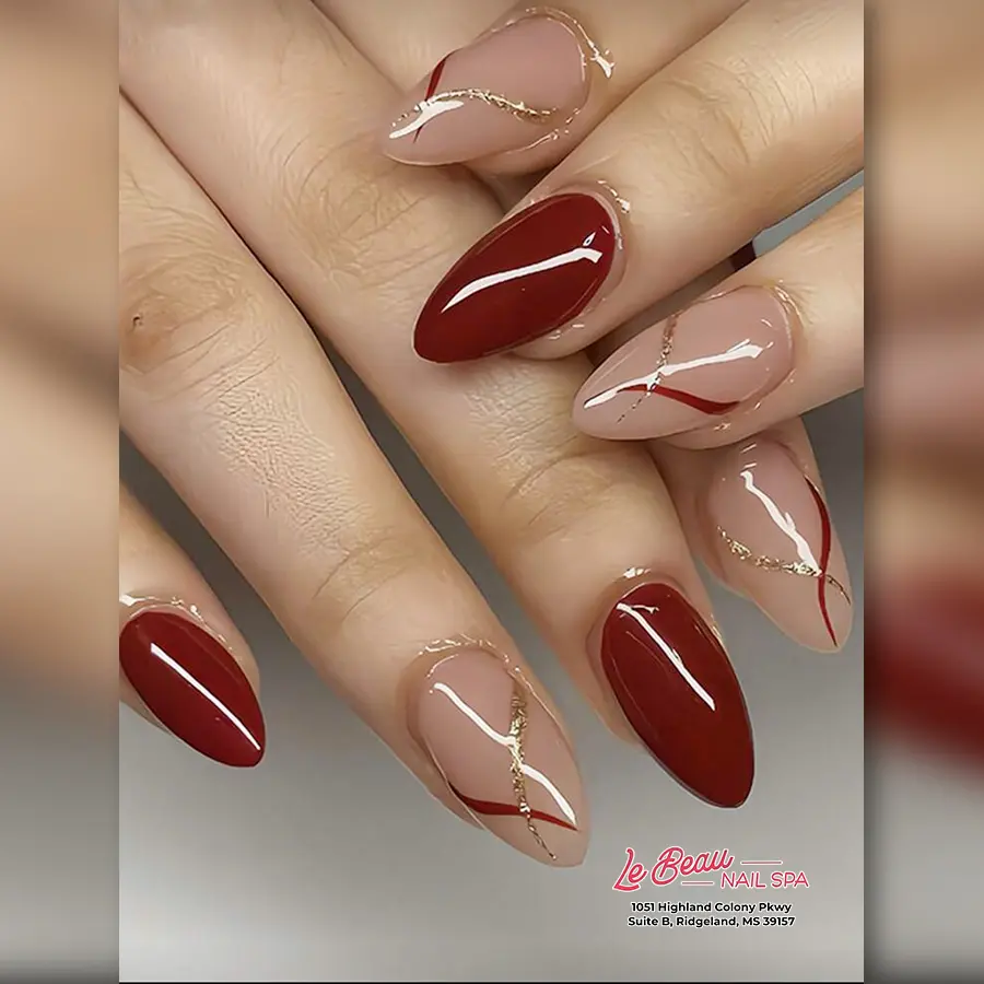 These wine red almond nails blend rich color with delicate gold line detailing for a sophisticated, elevated look. The contrast between the deep red polish and soft nude base keeps the design balanced and classy. Ideal for those who want red wine nails that feel minimal but luxurious.