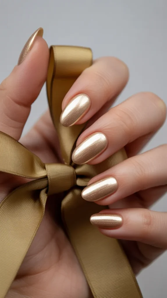 Champagne gold almond nails radiate soft festive energy. The golden sheen over beige gives a polished, luminous glow that’s perfect for classy Christmas nails. It’s the understated sparkle that always gets noticed. 🎀