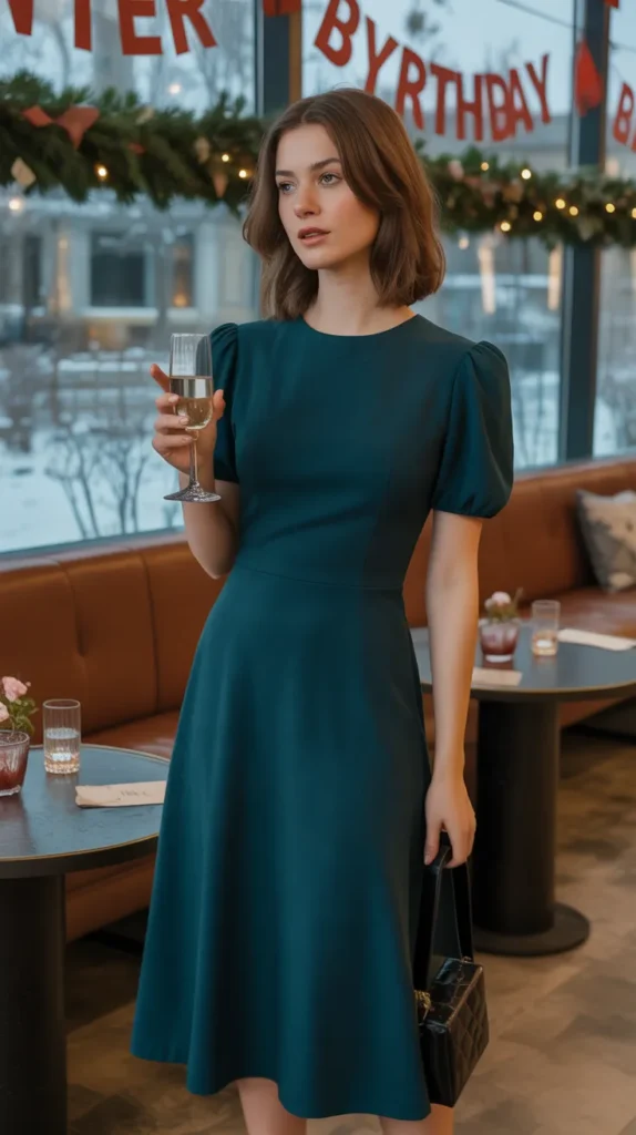 The subtle drama of puff sleeves mixed with rich teal fabric creates a beautifully balanced winter birthday dress look. Add gold jewelry and strappy heels for a refined evening ensemble.