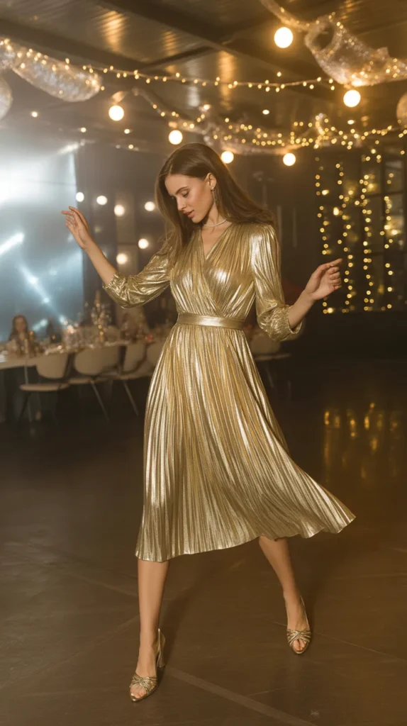 Golden hues never miss for party season. This winter birthday dress radiates luxury, and its soft metallic shine adds just the right amount of glam. Finish with minimal jewelry and glossy lips for birthday perfection.