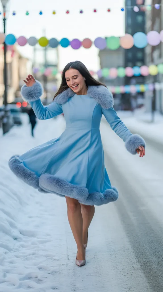 9. Baby Blue Long-Sleeve Dress with Fur Trim