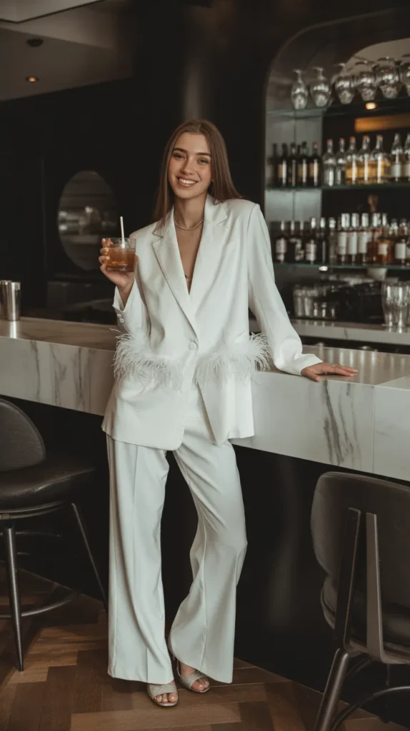 A feather-trim blazer paired with wide-leg pants and heels is bold, stylish, and just the right amount of extra because birthdays are for standing out, not blending in.