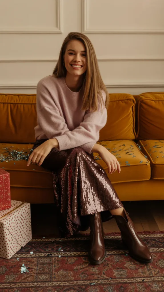 A sequin skirt paired with a cashmere sweater and boots keeps things elegant yet relaxed. The sparkle says โcelebration,โ while the knit says โcomfort first.โ