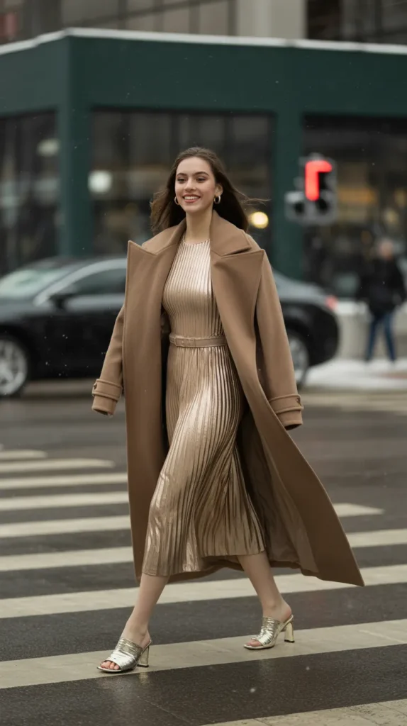 A metallic dress with a long wool coat and heeled mules is classic and glowy ideal for a dinner date or a night that ends with cake and compliments.