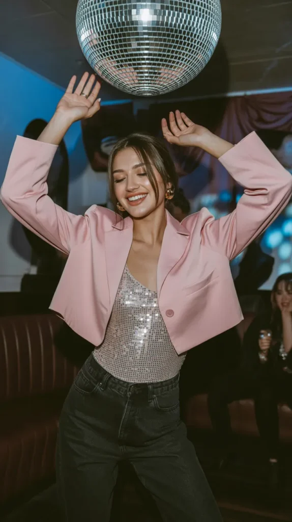 A cropped blazer over a sequin bodysuit with black jeans and heels gives party-girl energy in the most wearable way. Itโs trendy, chic, and totally dance-floor-approved.