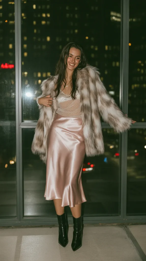 A satin slip skirt with a sheer top, faux fur coat, and ankle boots feels playful yet refined. The mix of light fabrics and cozy outerwear is the perfect formula for party fits that donโt sacrifice warmth.