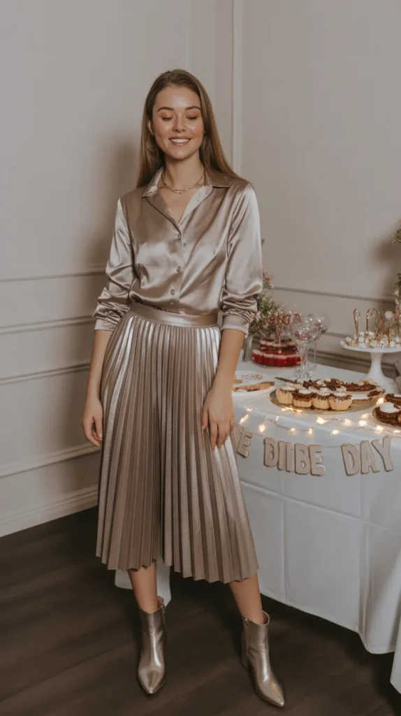 Pair a satin blouse with a metallic skirt and ankle boots for a festive look that glows in every light. This outfit screams โIโm celebrating,โ without saying a word.
