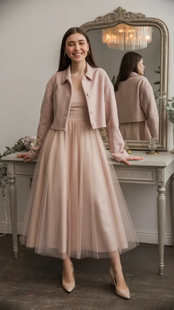 Go full fairytale with a tulle midi dress, a cropped wool jacket, and pumps. This outfit is sweet, feminine, and perfect for making birthday wishes in style.