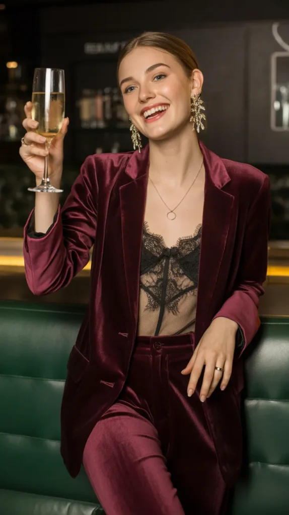 A velvet suit with a lace cami and statement earrings delivers boss-level energy. This winter birthday outfit says, โYes, itโs my day and I know it.โ