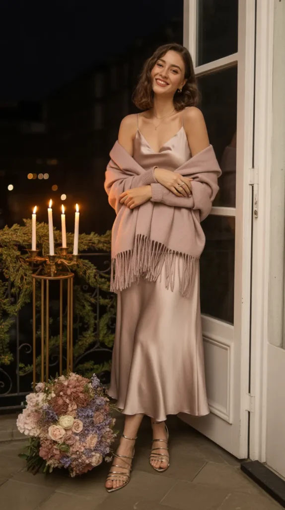 A satin maxi dress with a wool shawl and strappy heels gives classic birthday elegance. Itโs warm, graceful, and the perfect look for champagne toasts or a candlelit dinner.