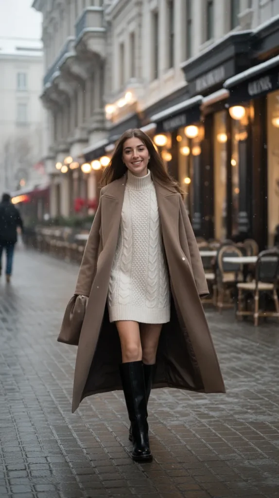 A white wool dress under a camel coat with knee boots feels fresh, clean, and absolutely dreamy. It’s timeless, sophisticated, and radiates that “chic in the snow” energy ❄️🤎.