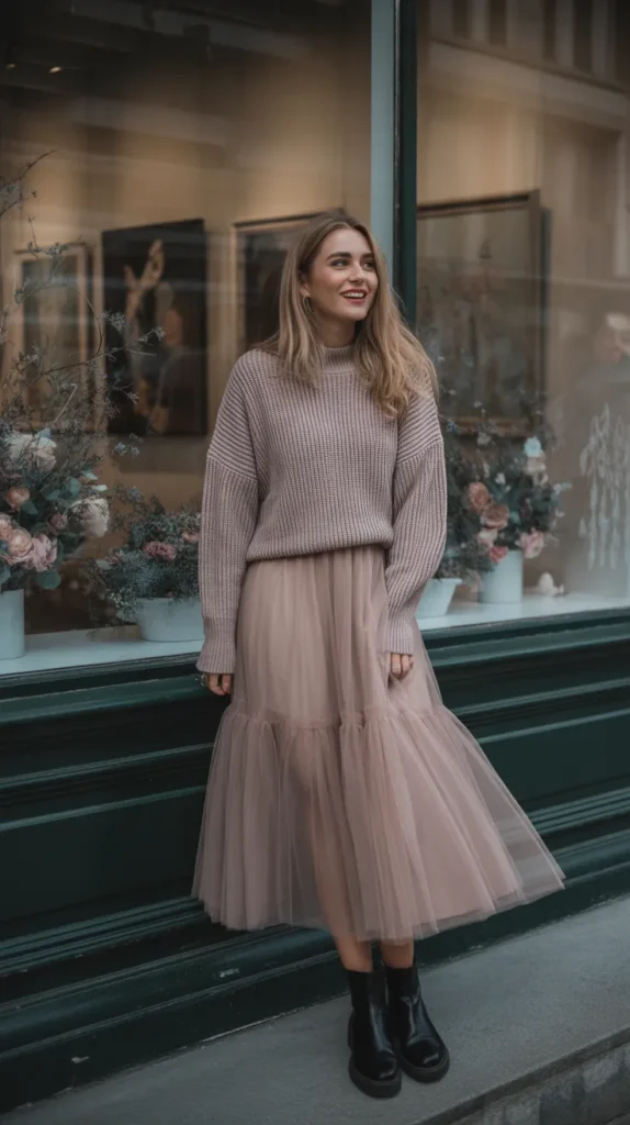 Pair a tulle midi dress with a chunky knit sweater and ankle boots for that romantic, Pinterest-perfect outfit. It’s soft, flowy, and feels like the fashion version of a snow globe moment ✨.