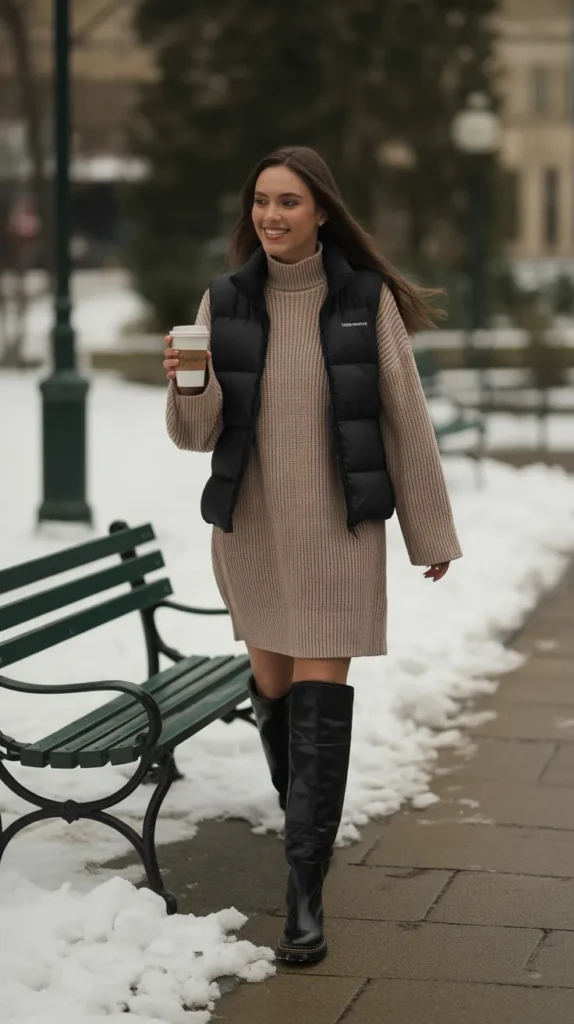 A ribbed sweater dress layered under a puffer vest and paired with knee boots is cozy and chic all at once. It’s perfect for weekend coffee runs or holiday shopping sprees comfy yet totally pulled together ☕🛍️.