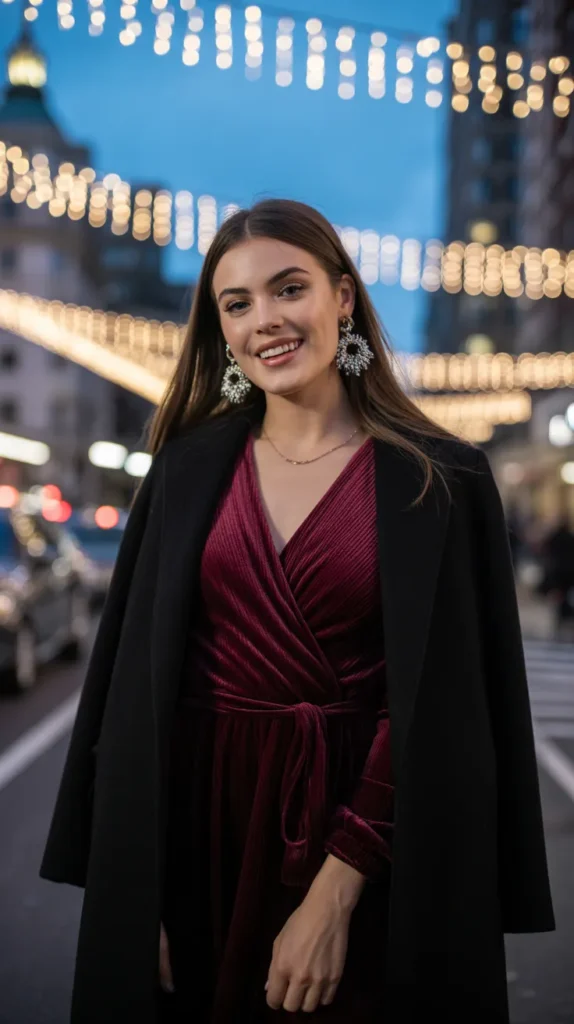 A velvet wrap dress with statement earrings and a long coat is a go-to for elegant evenings. It’s simple, sultry, and warm enough for winter parties. Add a clutch or bold heels for extra glam 💃.