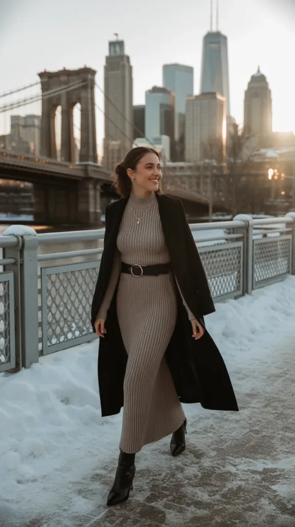 A sweater maxi dress layered with a belted coat and heeled boots creates an elongating, elegant silhouette. It’s classy and quietly powerful like boss energy wrapped in knitwear. 👢