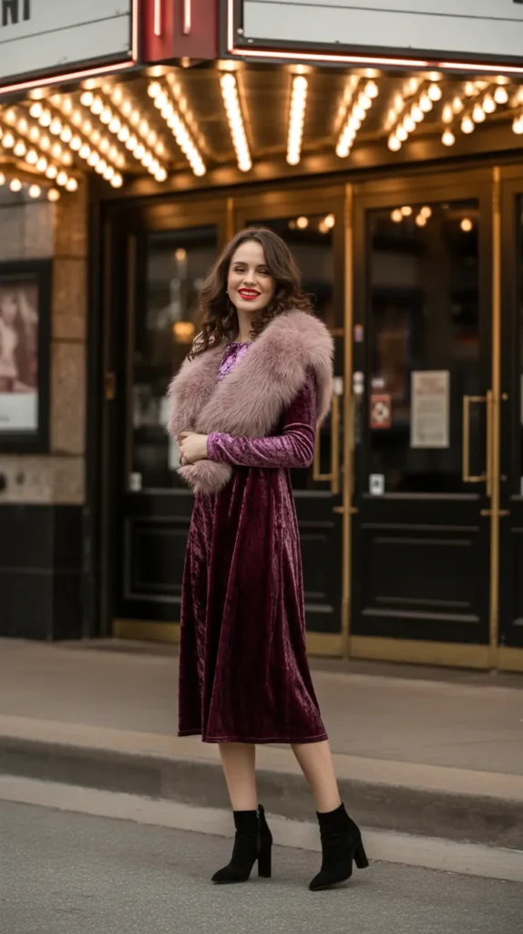 A velvet midi dress paired with a faux fur stole and heeled booties feels straight out of an old movie in the best way. It’s soft, luxe, and made for cozy winter evenings. ✨ Perfect for dinner nights when you want to look polished but still feel warm and comfortable.