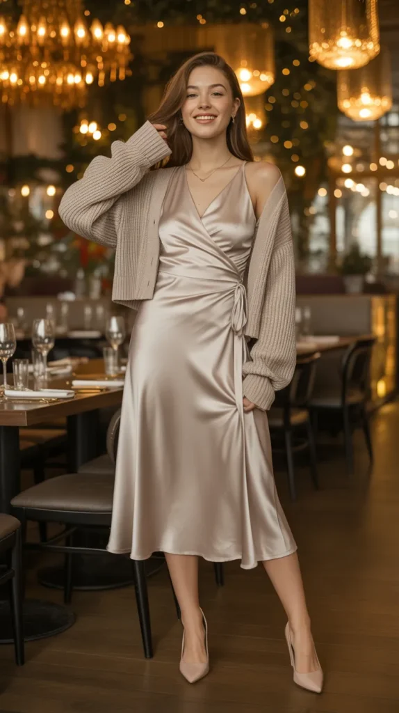 A satin wrap dress under a cropped cardigan paired with heels creates that soft, feminine shine perfect for evening dinners. It’s subtle, romantic, and oh-so-chic ideal for a winter date night or special celebration 💫.