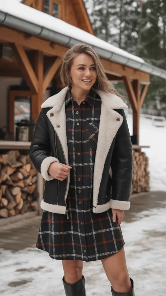 A plaid shirt dress styled with a shearling jacket and knee boots brings warmth and texture to your winter wardrobe. It’s a comfy and casual look that still feels put-together kind of like wearing a hug that happens to be stylish 🧣.