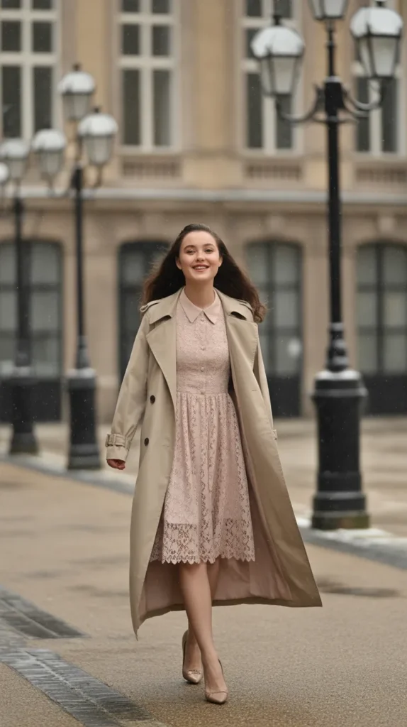 A lace dress under a trench coat with pumps gives off classic elegance that never fails. It’s perfect for winter weddings or upscale dinners just add pearl earrings and you’re good to go. ✨