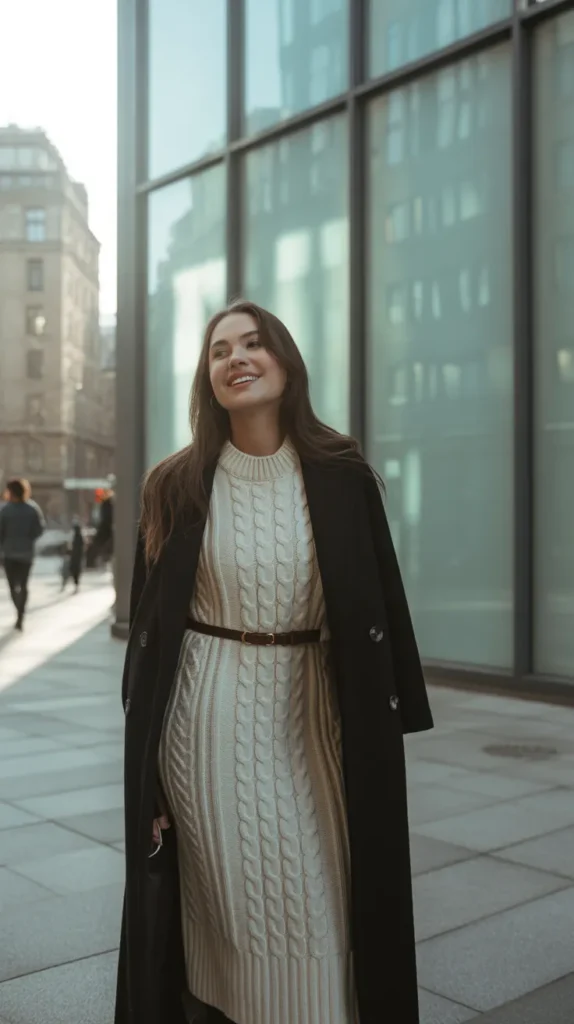 A cable-knit maxi dress cinched with a belt and topped with a wool coat strikes the perfect balance between cozy and refined. It’s elegant, warm, and a little bit dreamy think fireside dinners or winter date nights ❄️.