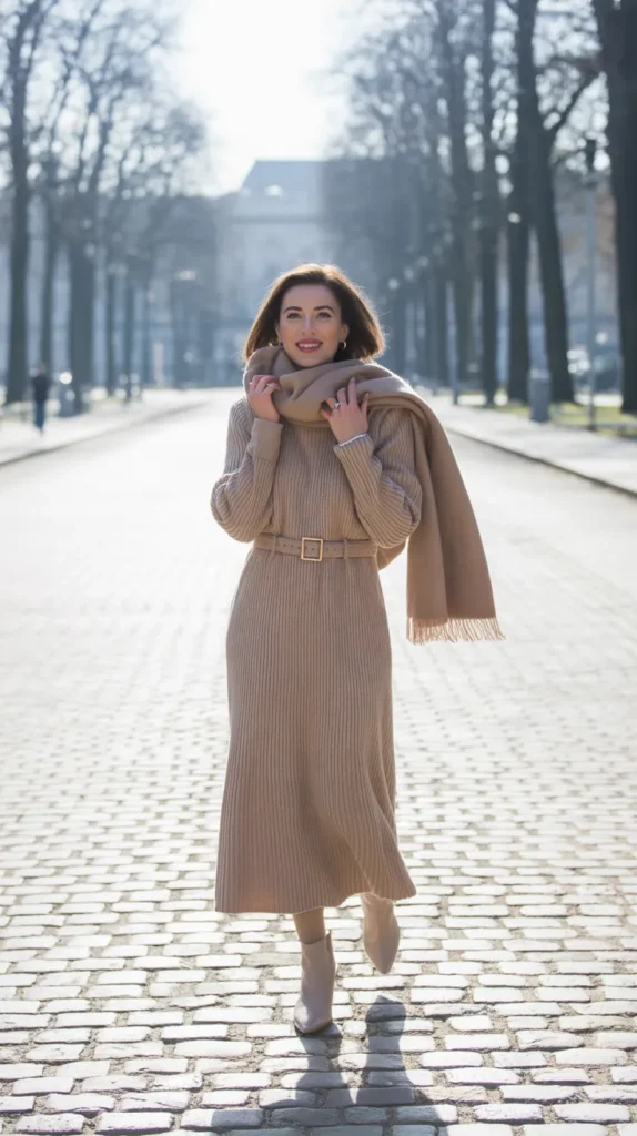 3. Beige Knit Midi Dress with Belt