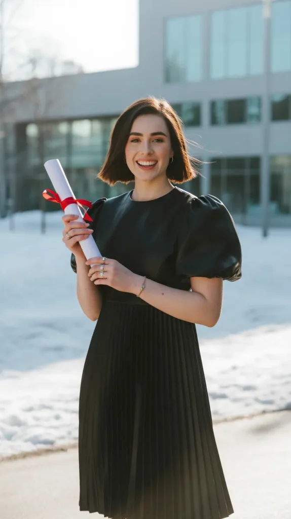 Elegant and timeless, this graduation dress pairs beautifully with a structured wool coat for a high-fashion winter aesthetic. Ideal for photo sessions or indoor celebrations, it’s the ultimate definition of simple sophistication.