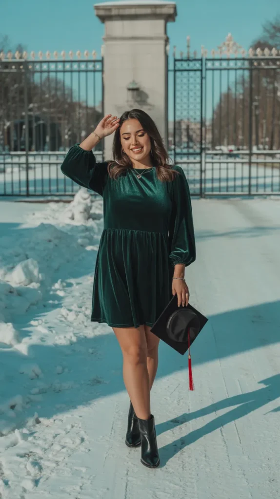Rich, luxurious, and perfect for the season velvet always wins for winter. The deep green hue brings a regal energy that photographs beautifully, making this one of the standout winter graduation dresses for bold yet elegant grads.