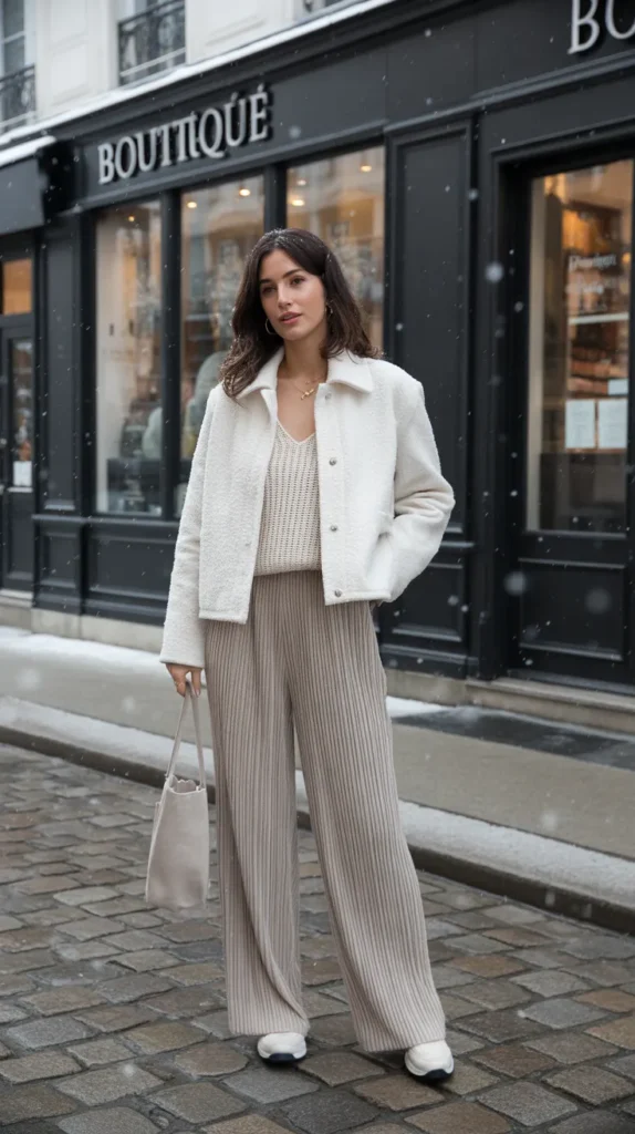 A bouclé jacket over a knit cami and pleated wool trousers is the definition of quiet luxury. It’s soft, elegant, and cozy all at once the kind of winter outfit inspo that makes you look expensive without even trying. Perfect for office days or lunch outings, it gives “I have great taste” energy while keeping you warm.