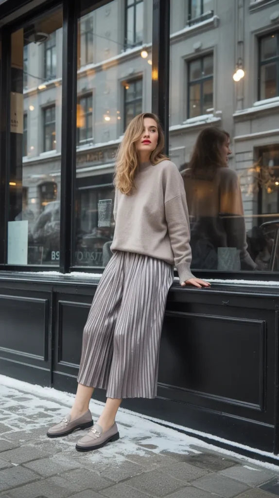 A cashmere sweater tucked into pleated culottes gives “effortless sophistication” every single time. It’s soft, breathable, and polished ideal for professionals who crave comfort without losing style. This winter outfit inspo piece is made for those who love clean, minimal dressing.