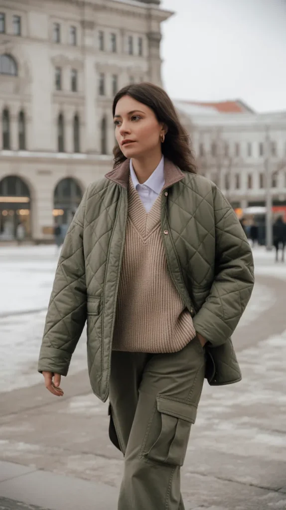 A quilted jacket layered with a sweater vest and cargo pants is the ultimate functional fashion combo. It’s warm, trendy, and full of casual attitude perfect for exploring the city or weekend adventures. This winter outfit nails the sweet spot between sporty and stylish.