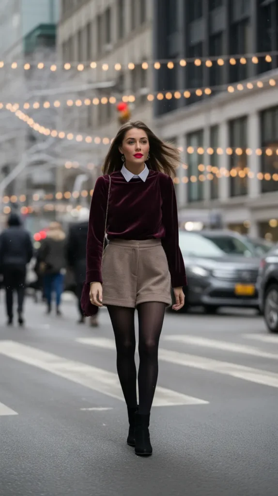 A velvet top with wool shorts and tights gives off cozy holiday energy in the best way. This cold weather outfit inspo idea is playful yet sophisticated, great for winter parties or cozy dinners. Add ankle boots and minimal jewelry to keep the look elevated but fun.