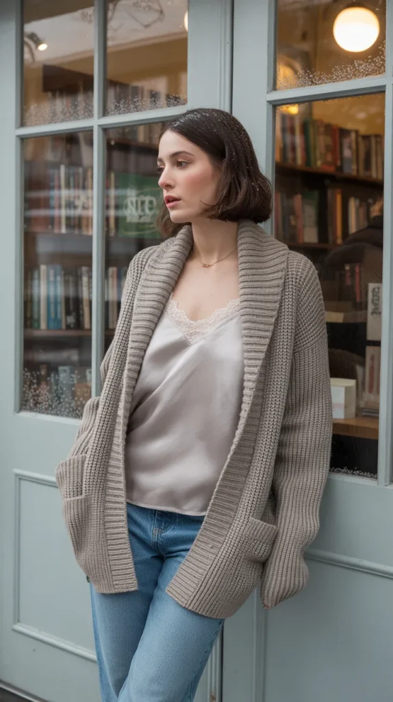 A shawl collar cardigan layered over a silk camisole and jeans gives quiet elegance with a relaxed twist. It’s perfect for cozy nights in or low-key outings. This winter fashion outfit balances softness and structure beautifully, giving you casual luxury vibes all day long.