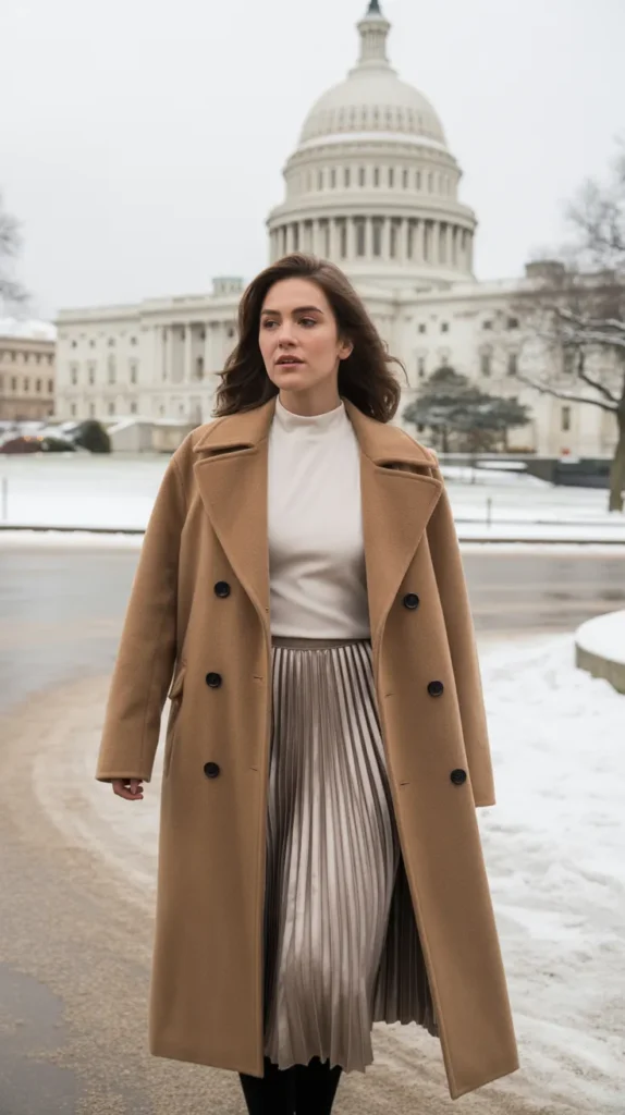 A structured peacoat paired with a mock neck top and pleated midi skirt is pure timeless chic. It’s the cold weather outfit that never fails elegant, easy to style, and warm enough for long city walks. Add tall boots and statement earrings for that extra touch of grace.