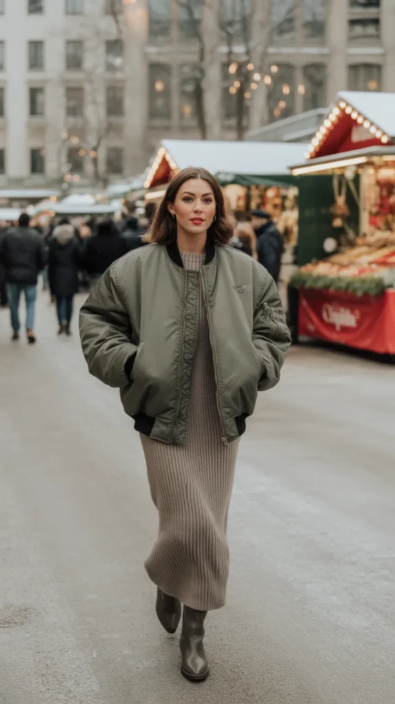 An oversized bomber jacket over a ribbed knit dress and tall boots gives off cool-girl confidence. This winter outfit inspo mix of masculine and feminine elements creates that effortless, balanced silhouette we all love. Perfect for days when you want to look stylish with zero overthinking.