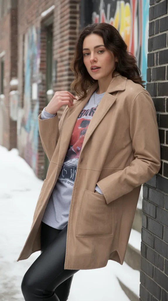 A faux suede shacket layered over a graphic tee with leather leggings brings that perfect mix of cozy and cool. It’s your go-to winter fashion outfit for off-duty weekends or casual coffee runs. Add sneakers or chunky boots, and you’re instantly giving effortless street style.