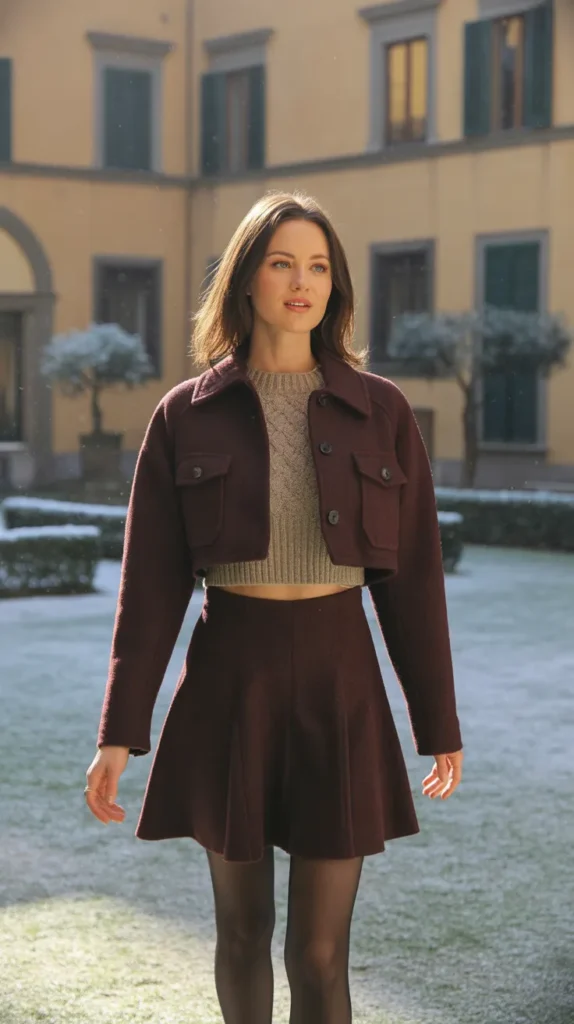 A cropped wool coat styled with a knit top and A-line mini skirt (plus tights, of course) creates the cutest winter brunch look. It’s playful yet polished the kind of winter outfit inspo that mixes warmth and youthfulness perfectly. Pair with ankle boots for that flirty, cozy finish.