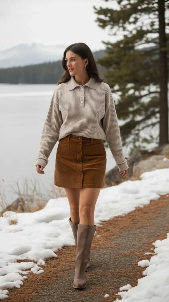 A ribbed polo sweater tucked into a corduroy skirt with knee boots gives major retro charm. It’s cozy, cute, and one of those winter fashion outfits that feels nostalgic yet current. Perfect for coffee dates or casual Fridays, it’s simple but surprisingly impactful.