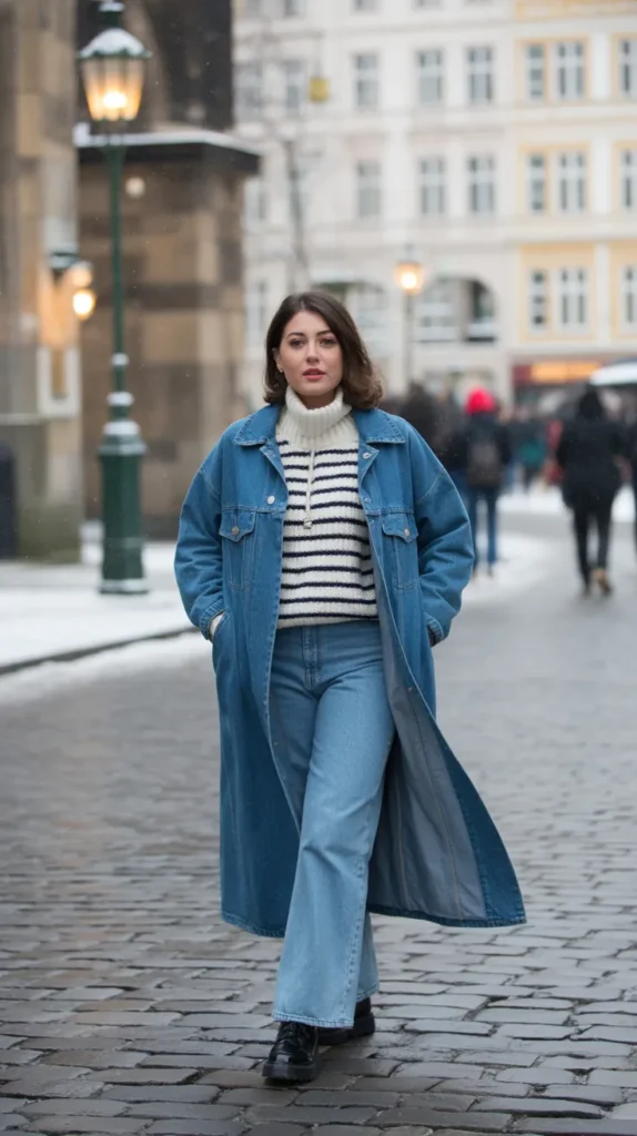 A longline denim coat layered over a striped sweater and wide-leg jeans creates effortless “French girl winter” energy. It’s casual, polished, and full of personality. Add a beret or a bold lip, and you’ve got your go-to cold weather outfit for cozy days in style.