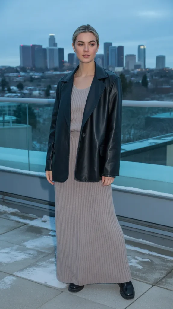 A faux leather blazer over a knit tank and maxi skirt is the perfect mix of edge and elegance. It’s a cold weather outfit that makes a statement without overcomplicating things. This look proves that layering can be both bold and refined perfect for nights out or creative office days.