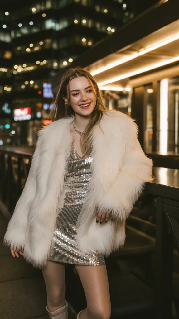 A sequin mini dress with a faux fur coat, sheer tights, and heeled boots is the ultimate “I came to shine” winter party look. It’s warm, dazzling, and totally photo-ready basically, your ticket to being the best-dressed person in any room.