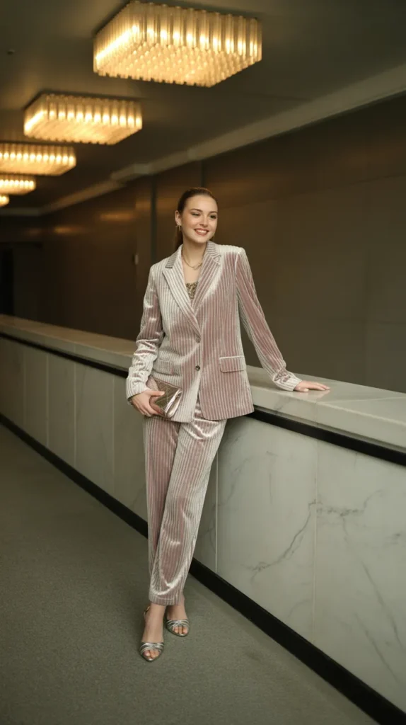 A velvet suit set with metallic heels and a clutch bag says elegance with authority. It’s a warm, luxurious choice for women who want their party fits to look as strong as they feel.