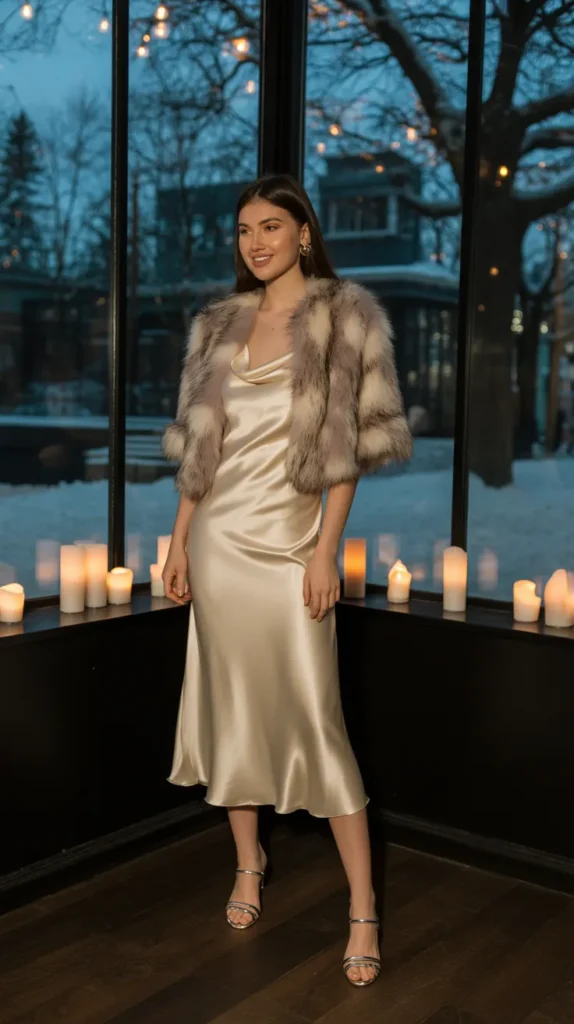 Pair a cowl-neck satin dress with a faux fur shrug and heeled sandals for timeless elegance. Whether it’s a holiday dinner or NYE countdown, this winter outfit guarantees you’ll glow in every sense.
