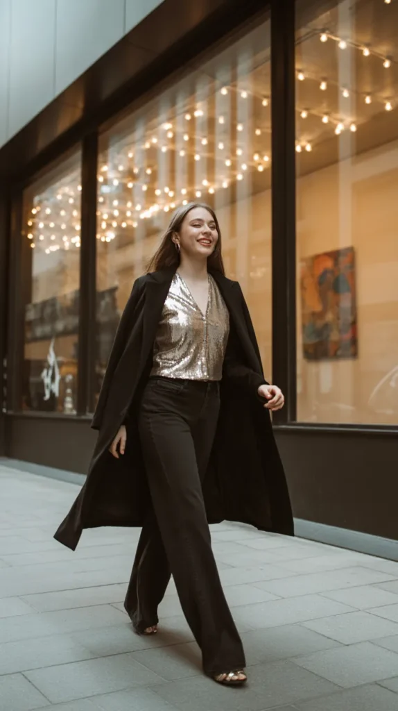 A sequin top with black wide-leg pants and a long coat balances shimmer with sophistication. It’s polished, sleek, and perfect for anyone who wants to sparkle without going over the top.