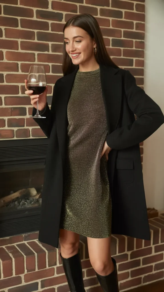A long-sleeve glitter dress paired with a belted coat and heeled boots gives all the sparkle, none of the shivers. This winter party outfit is equal parts classy and cozy perfect for dinner dates or upscale gatherings.