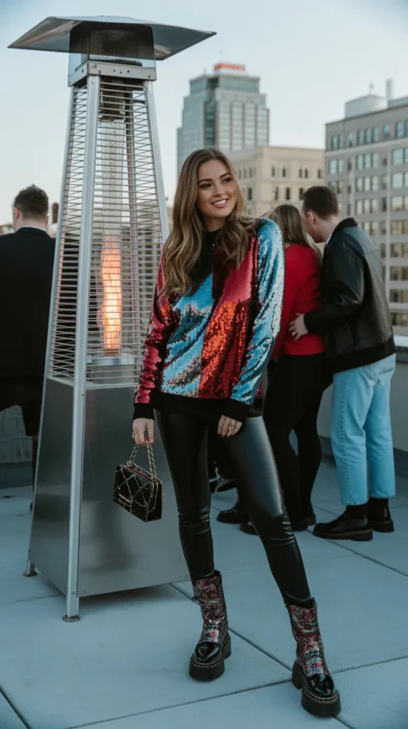 A sequined sweater paired with leather leggings and statement boots is where cozy meets glitter. It’s laid-back glam that still feels elevated perfect for house parties, holiday gatherings, or just sparkling through a snowy night.