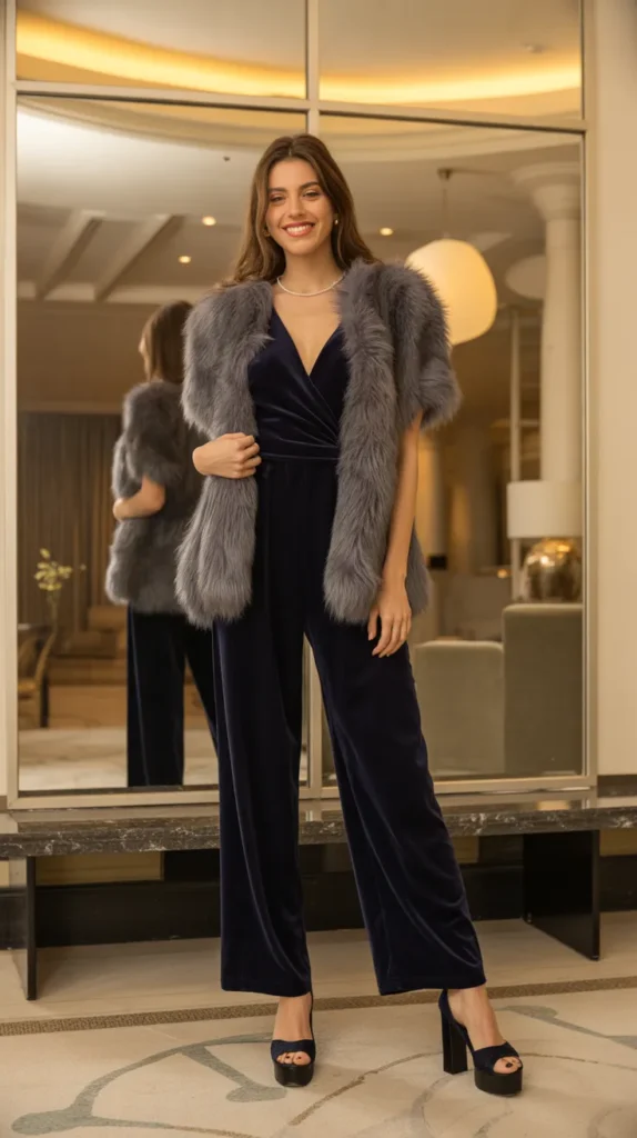 A velvet jumpsuit with a faux fur stole and platform heels delivers instant old-Hollywood drama. It’s warm, regal, and made for grand entrances the kind that makes everyone pause mid-sentence.