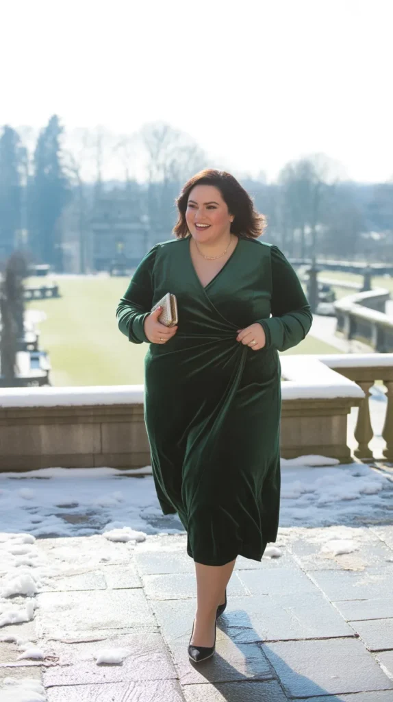 10. Forest Green Velvet Wrap Dress (Plus Size Friendly)
