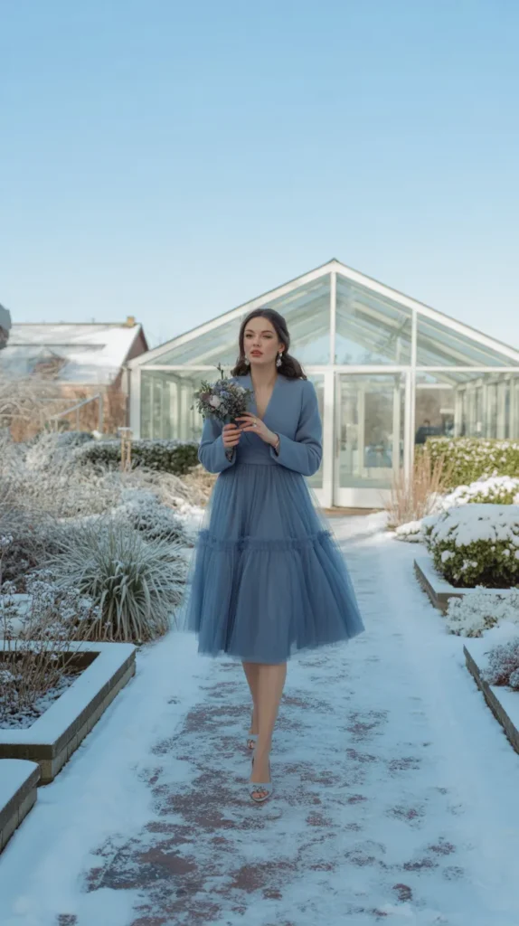 Whimsical and winter-appropriate, this soft blue tulle gown gives off ethereal energy. Perfect for romantic garden-style or snow-inspired weddings just add a delicate silver clutch and matching heels.